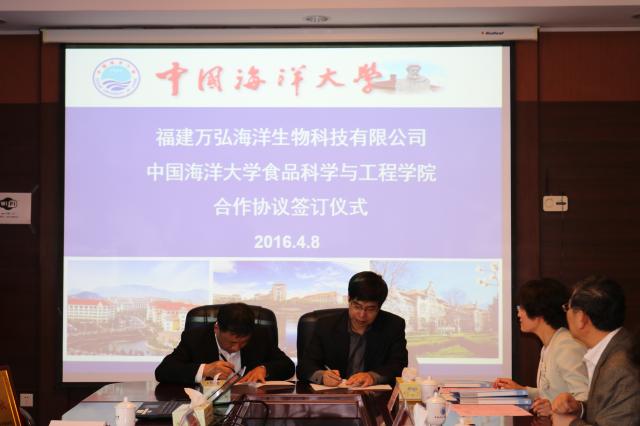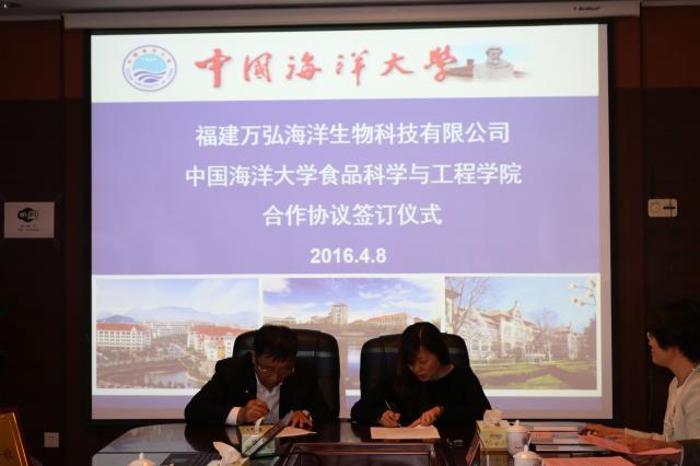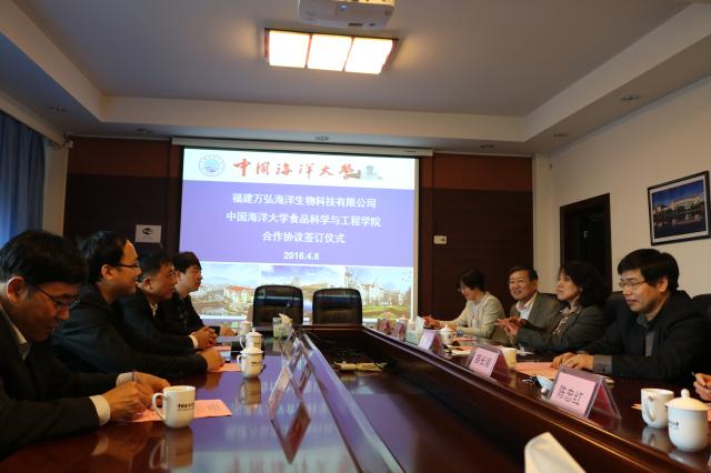 本站讯 4月8日下午,福建万弘海洋生物科技有限公司与91热爆 食品科学与工程学院(以下简称食品学院)合作协议签字仪式在行远楼会议室举行。