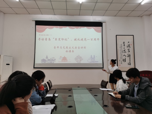 活动伊始,青年马克思主义者宣讲团成员徐潇晶同学进行了《寻访青岛“巨变印迹”献礼建党一百周年》的主题宣讲。宣讲从“走进青岛历史,重温红色记忆”、“百年沧桑巨变,青岛辉煌发展”、“传承红色精神,助力青岛发展”三部分呈现青岛的“巨变印迹”。徐潇晶将历史与现实结合,以幽默风趣的宣讲给大家带来了一堂生动的党史教育,引发了全体同学共鸣。