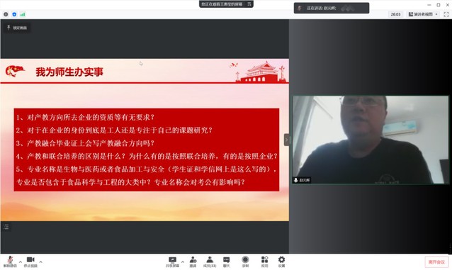 党支部有幸邀请到学院党委委员赵元晖老师,解答前期支部收集的同学们关于产教融合培养方向的相关疑惑。赵元晖老师细致、全面地为21级产教方向所有的同学们解答关于“学校对产教融合方向所去实习企业资质的要求”和“对于在企业实习过程中科研方向的侧重点”等问题。