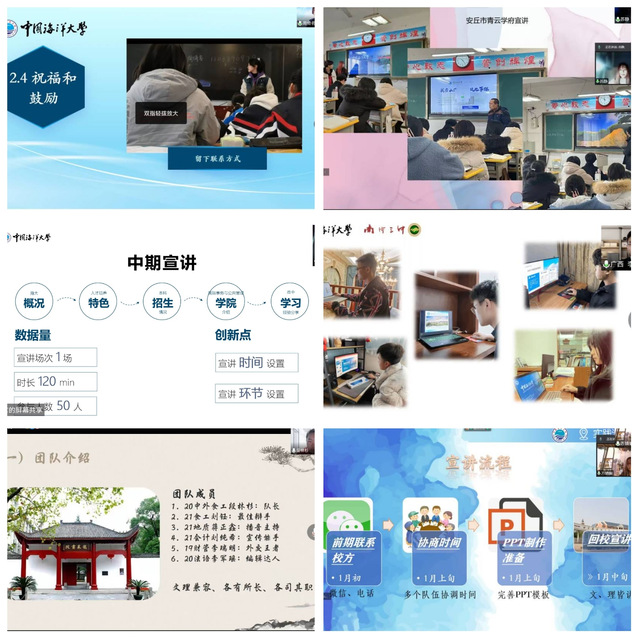 会议伊始,主持人薛晓龙对全体参会师生表示热烈欢迎并简要介绍答辩规则。随后各团队围绕宣讲初衷、宣讲历程、团队创新、收获总结等内容进行实践成果展示,丰富的图片、生动的视频、动情的讲述,使与会成员和各团队共同回顾了一段段精彩纷呈的宣讲实践之旅。“青岛的海很美,风景也很独特,这座城市令人神往。我会一直努力,希望两年后能够成为你们的学弟,和你们一起欣赏绚烂的樱花。”这是一个宣讲团在实践结束后收到的高中学弟的短讯,充分体现宣讲实践的价值和意义——打开视野,播种希望。