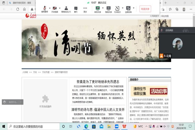 4月10日,2018级食品科学与工程3班团支部开展以“清明祭英烈,共铸中华魂”为主题的团日活动,33名团员共同观看人民网关于清明节云祭祀先烈的记录,学习英烈精神。清明节前后,全国各地纷纷缅怀革命英烈,纪念人民英雄。从中国人民抗日纪念馆到全国各地的烈士陵园,从网上纪念活动到各地祭祀仪式,全国人民以不同形式追思心目中的民族英雄。通过缅怀革命先烈,弘扬民族精神,提升民族凝聚力、认同感。