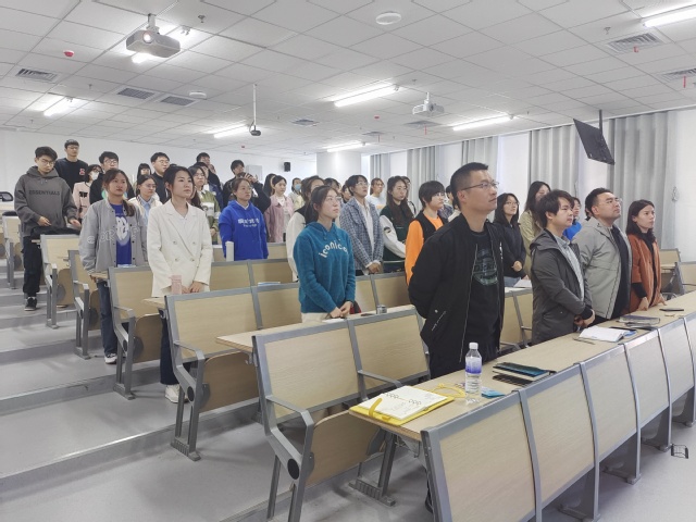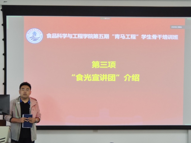 接下来,张川老师为全体师生介绍了“食光宣讲团”的有关情况。“食光宣讲团”为学生们提供了一个与优秀学子交流的平台,无论是在学习考研上还是在科研竞赛上,都有优秀学子为大家答疑解惑。会上,张川老师依次对“食光宣讲团”成员索雅茹、饶俊、陆雪、骆佳潼、石宝琳、戚文凯进行了介绍。随后,食光宣讲团成员集体宣读了“食光宣言”,表明了做好引领与服务的信心与决心。