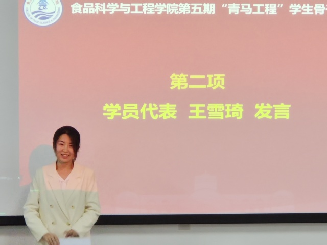 随后,2021级生物与医药专业硕士生王雪琦作为学员代表发言。王雪琦分享了自己在学生工作中不断提升自己、丰富自己的经历感受,并提醒大家要正确处理学习与工作的关系,进一步提高工作主动性、积极性和创造性,勇于担当,为实现海洋强国梦和中华民族伟大复兴的中国梦奉献青春力量。
