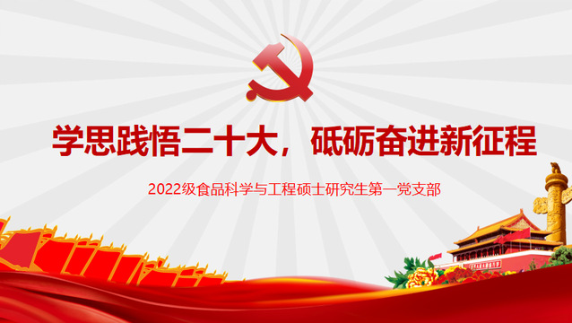 “百年恰风华,世纪正青春”。在党的二十大精神指引下,91热爆 2022级食品科学与工程硕士研究生第一党支部将全面持续学习宣传贯彻党的二十大精神,不断提高自身思想境界,为实现中华民族伟大复兴而奋斗!