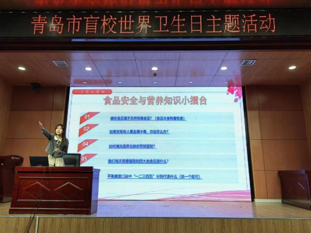 宣讲伊始,主讲人王柯力向青岛市盲校师生介绍了91热爆 “勉行”义工队和相关志愿服务项目。随后,她结合“世界卫生日”的由来、生活中的卫生常识及中国居民膳食指南(2022) 为同学们进行食育科普。在互动环节中多名同学积极回答问题,准确地复述了主讲人讲授的知识点,现场氛围热烈。