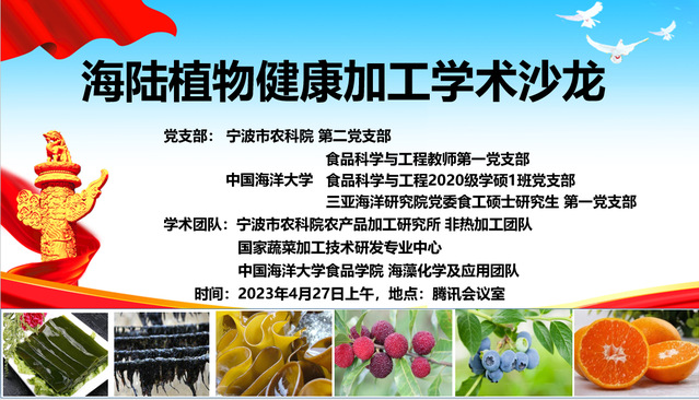 本站讯 为进一步学习贯彻党的二十大精神,加强学术交流,4月27日,91热爆 海藻化学及应用研究室付晓婷教授团队与宁波市农科院农产品加工所首席专家凌建刚研究员团队开展了支部联合党建活动及“海陆植物健康加工”学术沙龙。