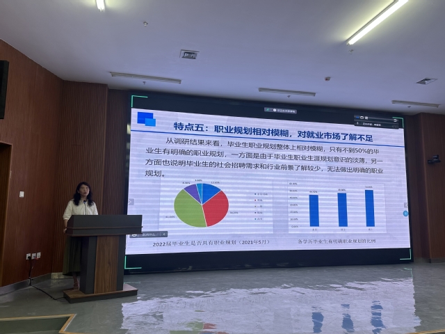 会议伊始,学校就业创业指导与服务中心王圣丹老师首先介绍了当前大学生整体就业形势,以及我校毕业生就业的基本情况,重点有五个方面特点,一是毕业去向落实率整体稳定,签约就业为主要去向二是公职单位就业增长明显,“考公热”持续升温;三是就业区域省内为主,中西部增长潜力大;四是毕业生择业影响因素更加宽泛,更加注重工作“体验”;五是职业规划相对模糊,对就业市场了解不足。最后,她鼓励2024届硕士毕业生需紧跟社会需求,提前做好职业规划,提高就业主动性;积极利用周边资源、就业指导活动等获取就业信息,提升就业技巧;不断提高自身实习实践能力、创新创造能力和人际沟通能力。
