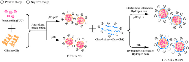 尽管岩藻黄素(FUC)具有抗氧化、抗癌和抗炎等多种生理活性,但其低水溶性对光和热的高敏感性限制了其在功能食品和饮料中的开发和应用。为了有效发挥FUC的有益功效有必要利用蛋白质-多糖相互作用形成复合物构建一种合适的递送载体来提高FUC的水分散性,以扩大其应用范围。麦醇溶蛋白(Gli)作为一种醇溶性蛋白可用于疏水性生物活性成分的递送,但其易聚集、稳定性差,而硫酸软骨素(ChS)作为一种从动物软骨中提取的粘多糖,具有较强的负电荷和较好的生理活性,可以与带正电荷的蛋白相互作用形成复合物,以改善蛋白质纳米颗粒(NPs)的稳定性。